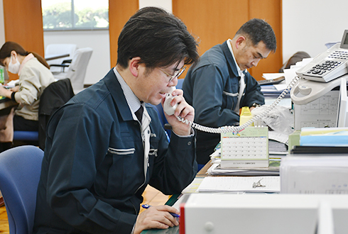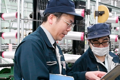 入社して6年目となりますが、現在は「撚糸品」と「綿帆布」を取り扱いされているお客様を担当しています。製品はルート品が多いため、常に出荷量を管理して在庫が切れないように製造部へ生産依頼をしています。その他材料の手配やコスト管理等が主な仕事内容です。