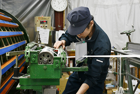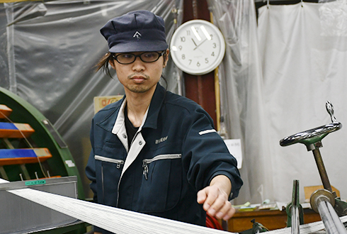 整経工程という撚糸品をビームに巻いて、織場にわたす仕事をしています。一人一人担当の機械があるので、より責任を持って仕事をしています。