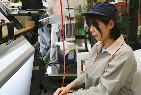 検反です。欠点の補修など細かな作業をしています。製品の最終検査を行う工程で、撚糸・製織された反物の欠点の見逃しがないように検査・修正する作業をしています。